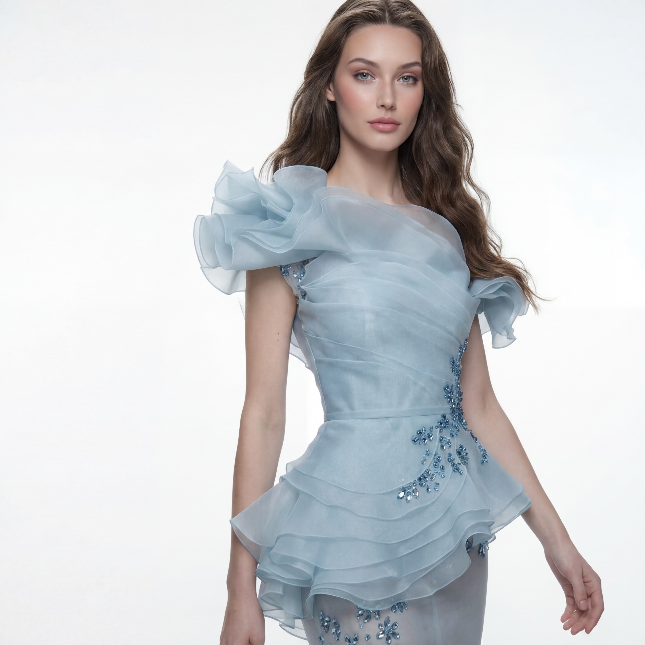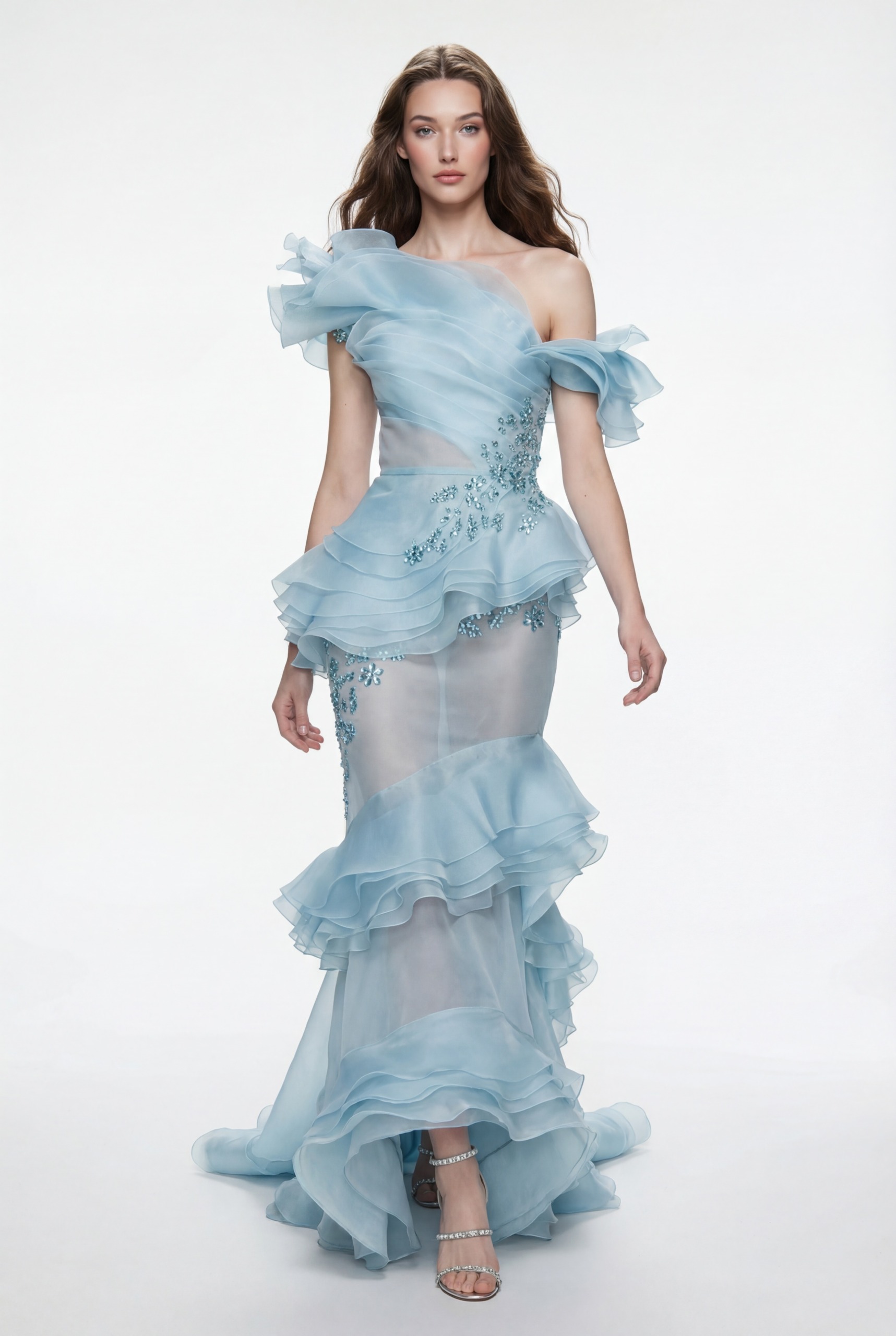Designed with a romantic couture approach, this Soft Troposphere Blue evening dress features a fluid silhouette enhanced by layered organza ruffles and delicate hand embellishment. The asymmetrical off-shoulder neckline creates a graceful balance between softness and structure, while the fitted bodice defines the waist elegantly.