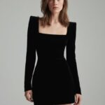 Net kare yaka kesimi ve keskin terzilik, yalın şıklığı modern bir hassasiyetle sunan zarif bir mini siluet oluşturur.