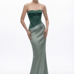 Mat ve parlak dokuların dengesi ile öne çıkan bu tasarım, yapılandırılmış korse formu ile üst bedeni kusursuz şekilde sarar. Straplez yaka detayı sade ve modern bir görünüm sunarken, üst kısmın mat yapısı güçlü bir duruş sağlar. Kalça kısmında başlayan saten drapeler eteğe akıcı bir geçiş yaparak uzun ve zarif bir siluet oluşturur. Mat ve parlak yüzeylerin kontrastı tasarıma derinlik kazandırır. Zamansız şıklığı modern bir dokunuşla buluşturan sofistike bir tasarımdır.