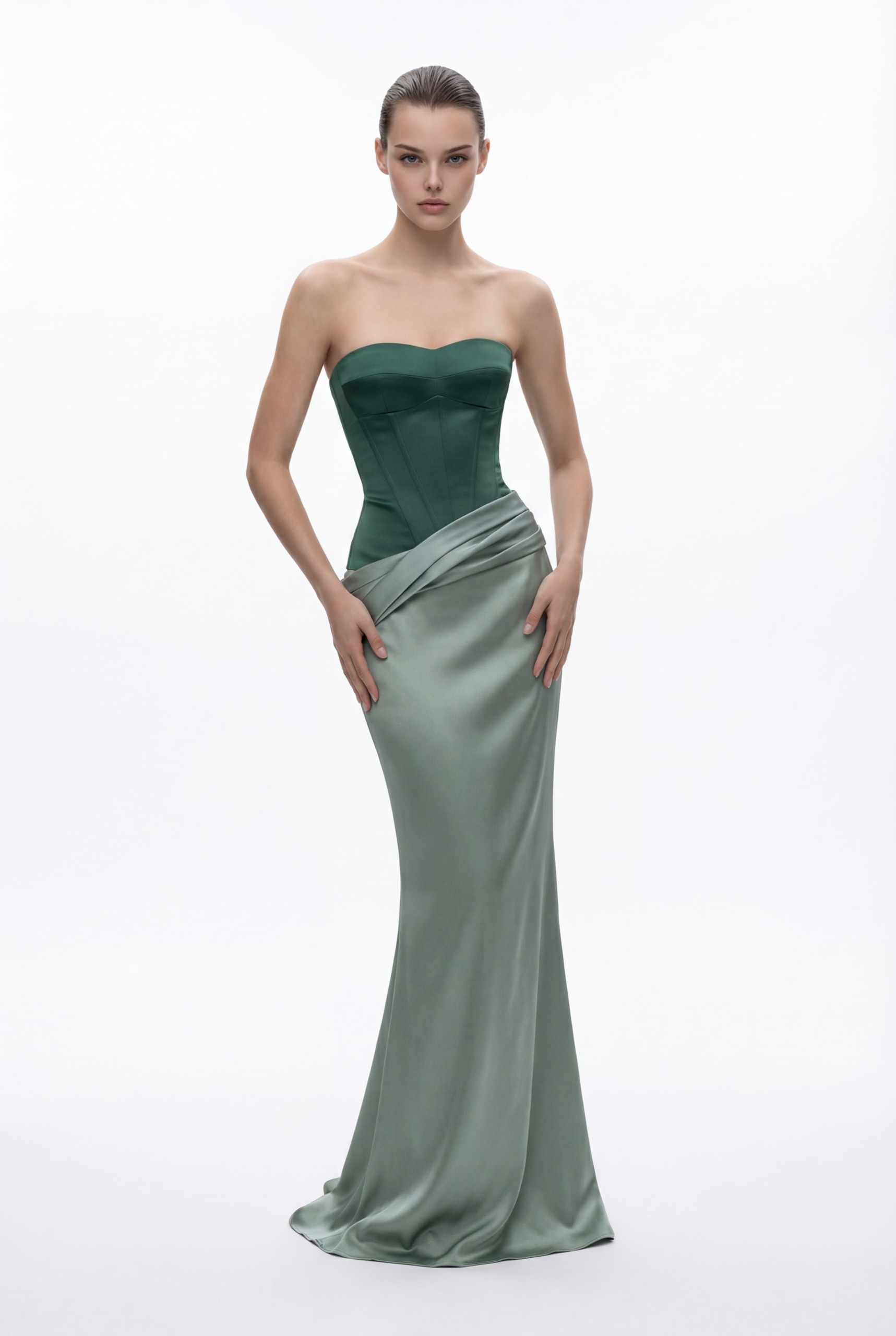 A refined silhouette combining structure and fluidity through contrasting textures. The strapless corset bodice is crafted in a matte finish, sculpting the upper body with clean, precise lines. The softly curved neckline enhances the décolletage while maintaining a modern, minimal look. The skirt introduces a smooth satin contrast, draped elegantly across the hips and flowing into a sleek, elongated form. The interplay between matte and shine creates depth and dimension, elevating the overall design. Tailored for a sophisticated presence, the look balances timeless elegance with a contemporary edge.