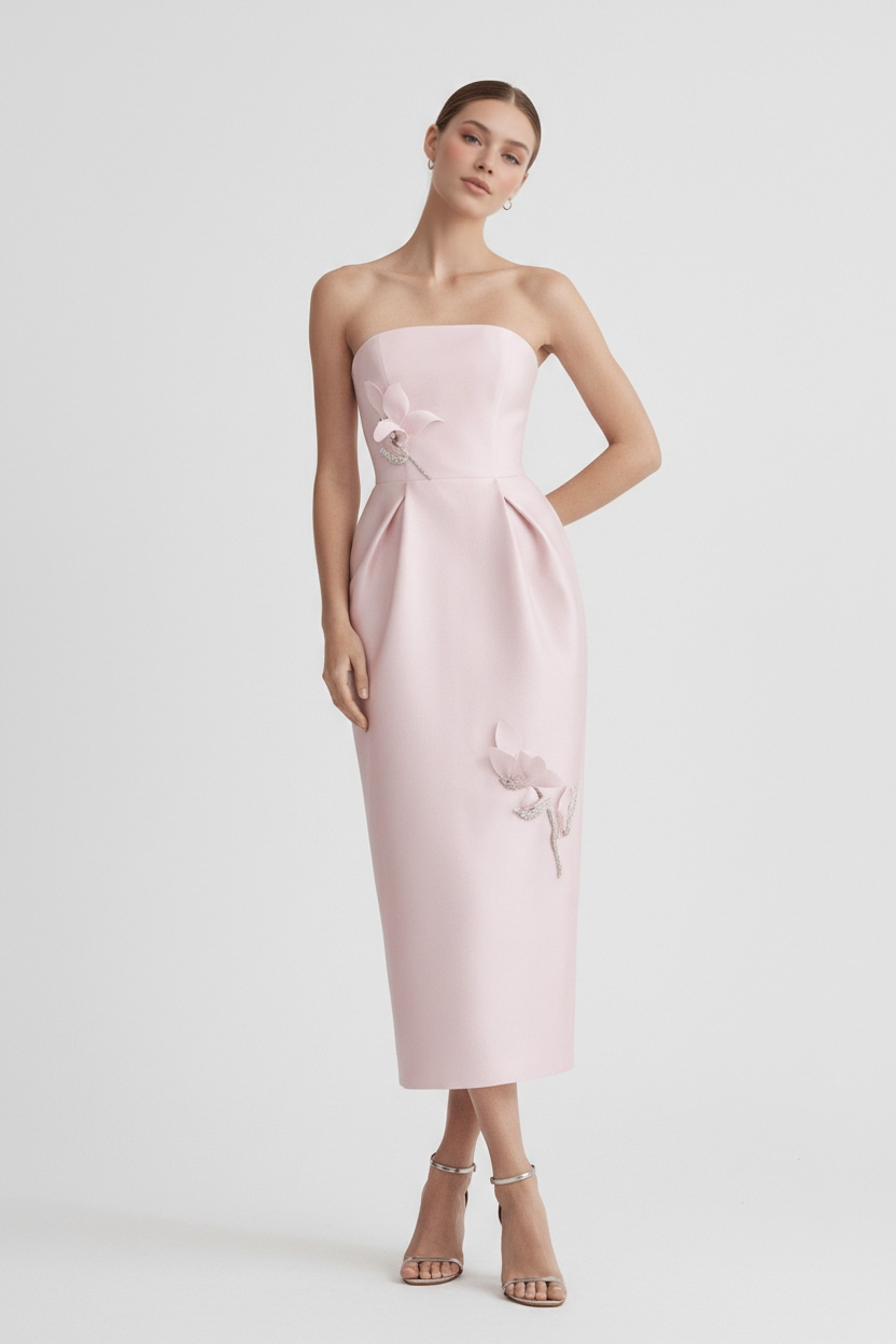 A strapless couture dress shaped with clean tailoring and delicate hand made floral embellishment placed on the bodice and skirt for a refined feminine impact. Precise construction and soft pastel pink tone create an elegant silhouette designed for timeless evening style.