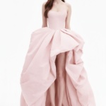 Straplez üst kısmı ve hacimli drapeli yüksek-düşük etek tasarımı ile öne çıkan modern bir akşam elbisesi. Bel hattını vurgulayan yapılı formu ve akıcı katlarıyla hareket ve zarafet sunar; modern davetler, resepsiyonlar veya couture esintili özel anlar için idealdir.