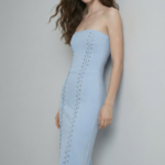 Featuring a strapless neckline, this evening dress is designed with a body contouring structure that enhances a sleek and elongated silhouette. The fitted construction offers elegant support while maintaining comfort and flexibility. Decorative lace-up details run vertically along the front and side, adding a modern edge and refined character to the design. The midi length balances sophistication with contemporary appeal, making the overall look both striking and versatile.