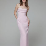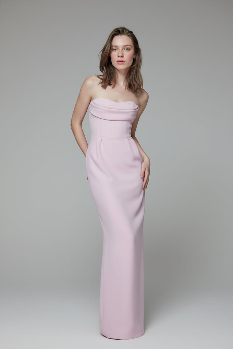 Zarif pastel pembe tonu ile öne çıkan bu straplez gece elbisesi, yumuşak kıvrımlı yakası ve temiz, uzun siluetiyle modern ve zamansız bir şıklık sunar. Yapılı krep kumaşı sayesinde pürüzsüz bir duruş ve kusursuz bir uyum sağlayarak feminen zarafeti ön plana çıkarır.