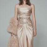 İpeksi saten dokusu ve zarif drape detaylarıyla bedeni kusursuz şekillendiren bu straplez akşam elbisesi, kristal işlemeleriyle bel hattını vurgular. Ön yırtmacı modern ve çekici bir görünüm kazandırırken, özel davetler için sofistike bir şıklık sunar.