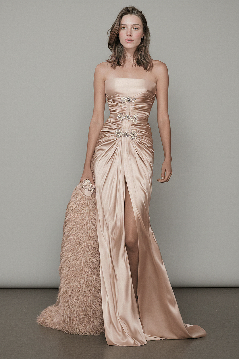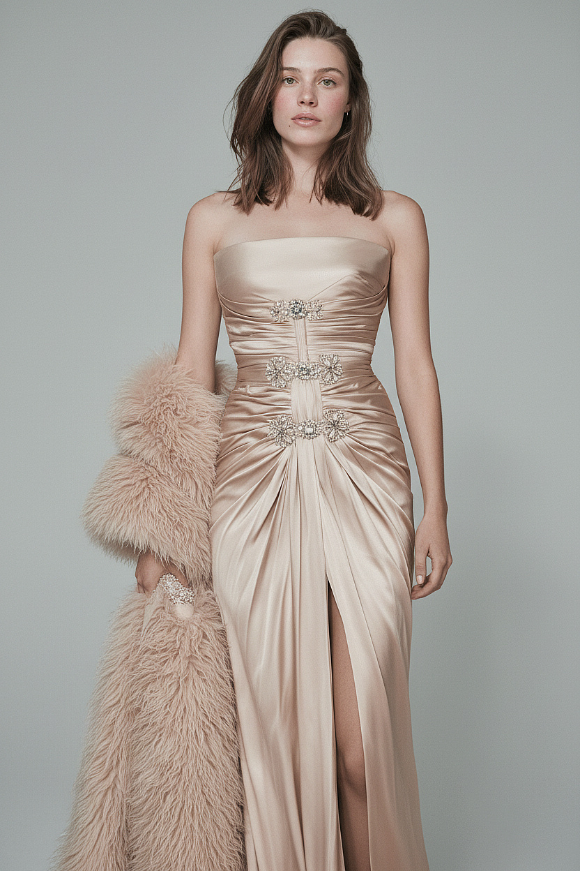A luxurious strapless evening dress crafted in silky satin, featuring elegant ruching that sculpts the silhouette. Crystal-embellished accents highlight the waist, while the front slit adds modern allure and effortless movement—perfect for refined occasions and red-carpet moments.
