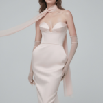This strapless midi dress is defined by a sculpted corset bodice with softly contoured cups, creating a refined décolletage and a perfectly balanced waistline. The fitted skirt follows the natural lines of the body, forming a clean and elongated column silhouette. Sheer chiffon gloves and an airy neck scarf add lightness and couture movement, bringing a poetic contrast to the structured base and elevating the look with modern romance.