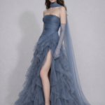 Katmanlı tül kumaştan hazırlanan bu straplez gece elbisesi, cool steel blue tonunu dumanlı ve gümüş alt yansımalarla bir araya getirir. Yumuşak drapeli üst yapı vücut hatlarını zarifçe vurgularken, yırtmaçlı ve hacimli etek tasarımı akışkan ve güçlü bir duruş sunar.Aynı tonda uzun tül eldivenler görünümü tamamlar; boyundan uzanan ekstra uzun tül şal detayı ise elbiseye dramatik ve couture bir etki kazandırır. Özel davetler, gala geceleri ve iddialı organizasyonlar için tasarlanmıştır.