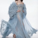 Couture bakış açısıyla tasarlanan bu troposfer mavisi gece elbisesi, zarif işçiliği ve akıcı siluetiyle öne çıkar. Straplez korsaj, gümüş tonlu el işçiliği nakışlar ve kristal detaylarla titizlikle süslenmiş olup ışıkla birlikte etkileyici bir parlaklık sunar. Belden aşağıya doğru dökülen transparan tül etek, etek ucundaki el uygulaması işlemeler ve hafif tüy detaylarıyla sofistike bir hareket kazanır. Görünümü tamamlayan çıkarılabilir tüy pelerin, tasarıma güçlü ve yumuşak bir ifade ekler; farklı stillerle kullanılabilir.